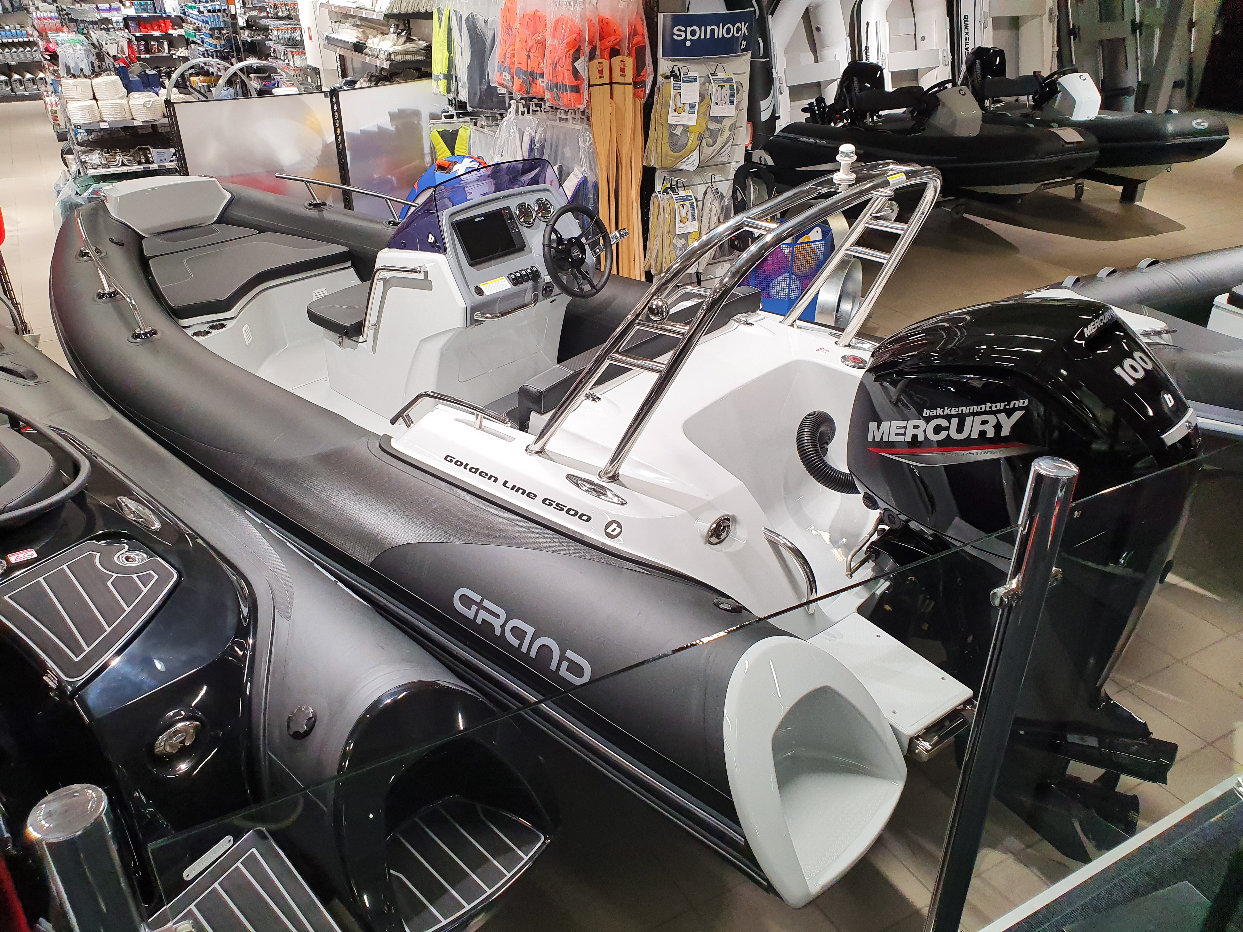 Det er ikke bare design, Grand 500 Golden Line er laget for å være praktisk og ergonomisk for deg som bruker. Dette innebærer en god og oversiktlig konsoll med behagelig sofa akter. Båten har mange lekre og smarte detaljer, alt fra de utallige lagringsrommene til stålrekke på pongtong fremme og innstøpt glassfiber avslutning på pongtongen. En perfekt RIB som egner seg like godt for vannsport og fiske som fine turer i skjærgården på late dager.