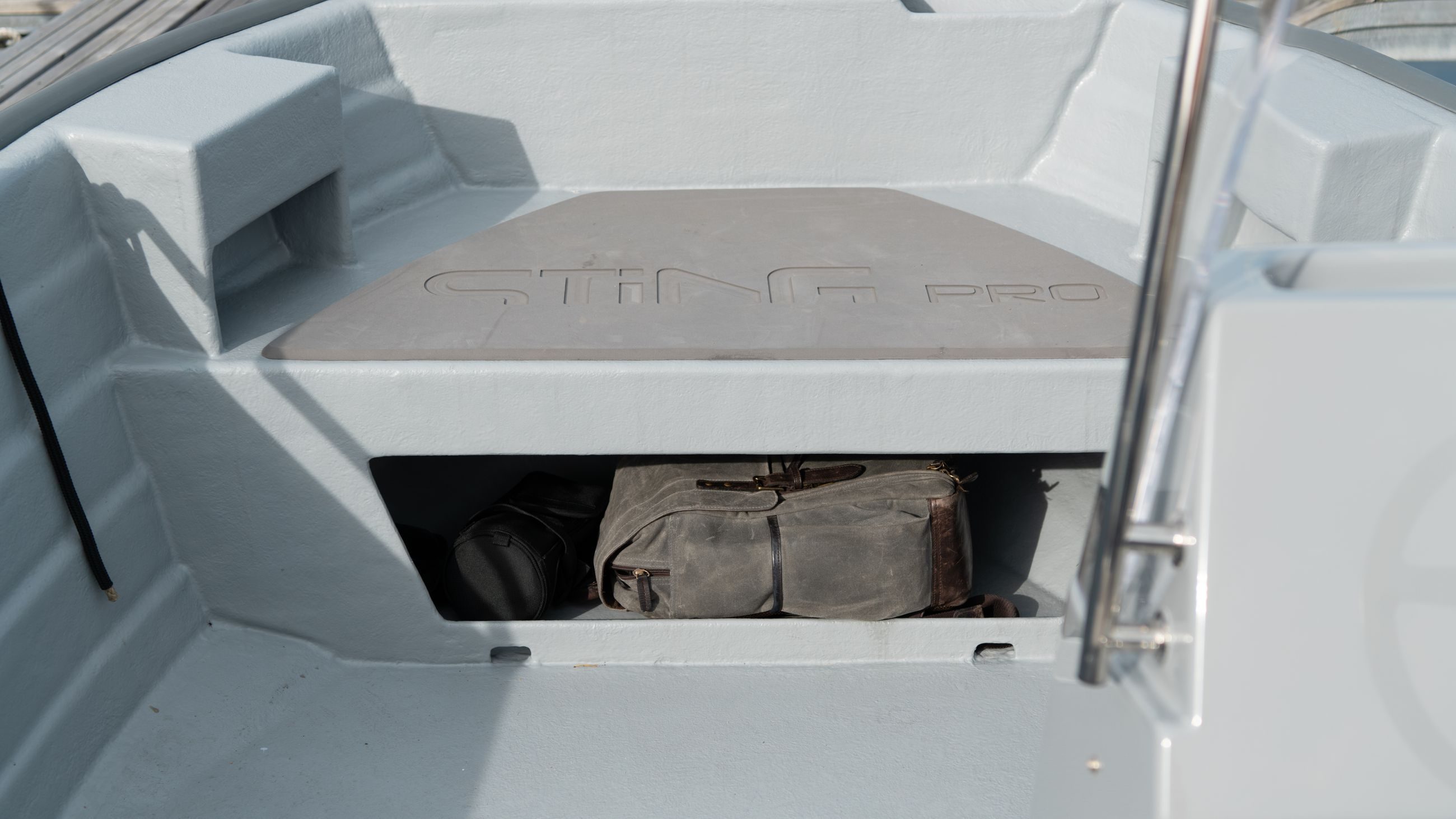 Baugpartiet i Sting 535 Pro kjennetegnes av en bred og romslig dørk, med god plass til passasjerer, bagasje eller fiskeutstyr. Båten har festebraketter som standard, tilpasset for teinehalere eller annet fiskeutstyr. I baugen finner du også et stort stuerom under sittebenken der du kan plassere utstyr tørt. Du kan også velge deg et EVA-dekke for benken i baugen, tofta ved styrekonsollen og på akterbenken, noe som gir passasjerene dine et lunere sted å sitte, og gir deg avlastning ved jobbing på i baugen og på akterbenken.