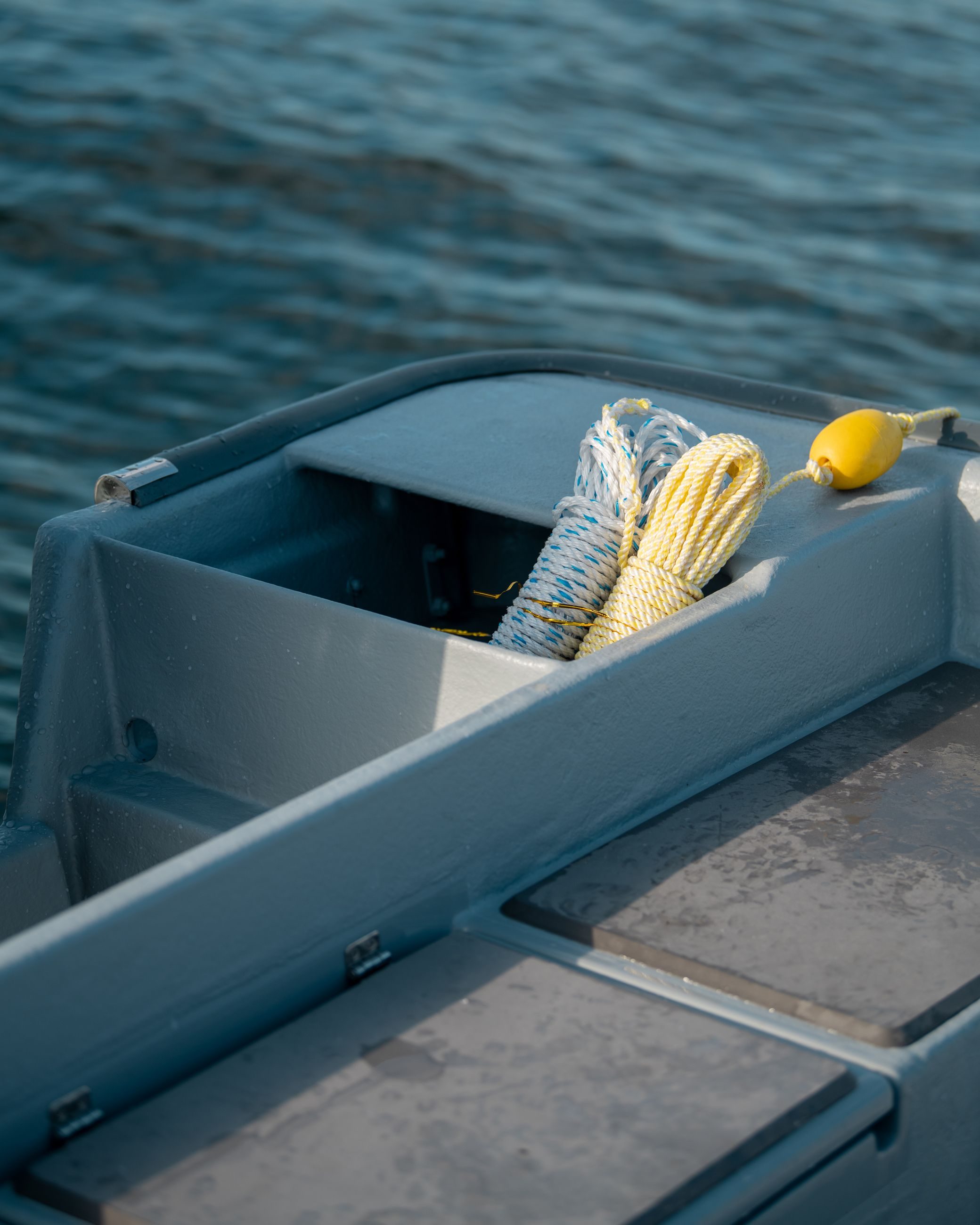 - Fortøyningspakke – 4 fendere med tau, 4 fortøyningstau, dregg med tau