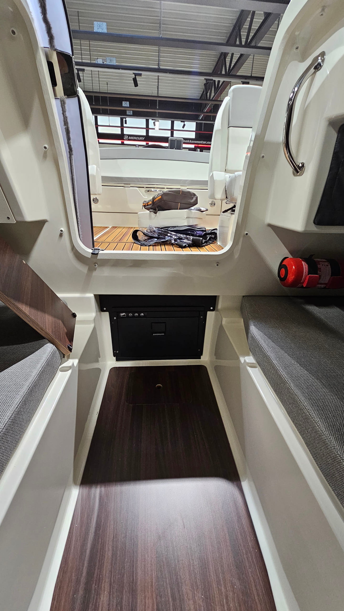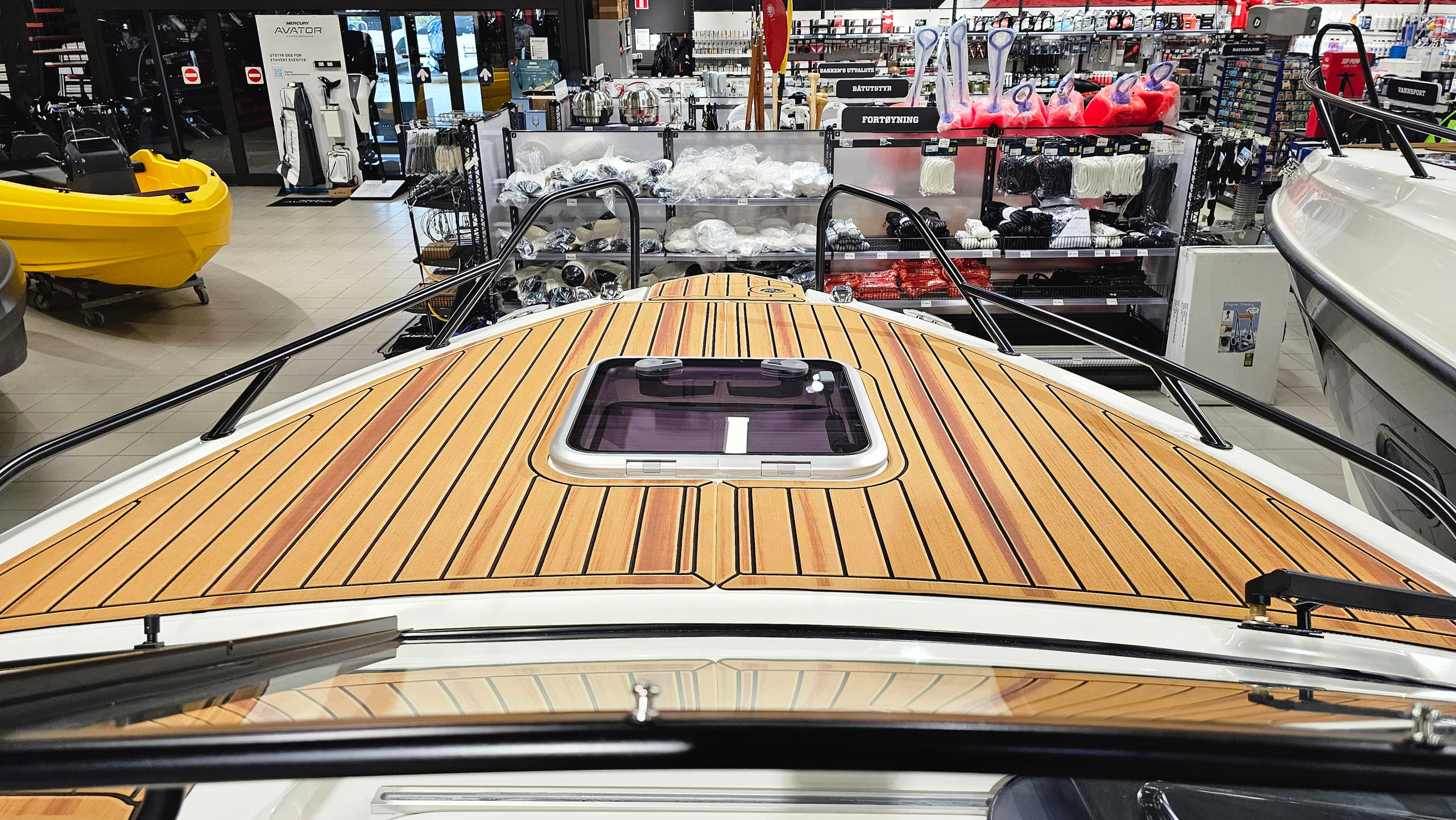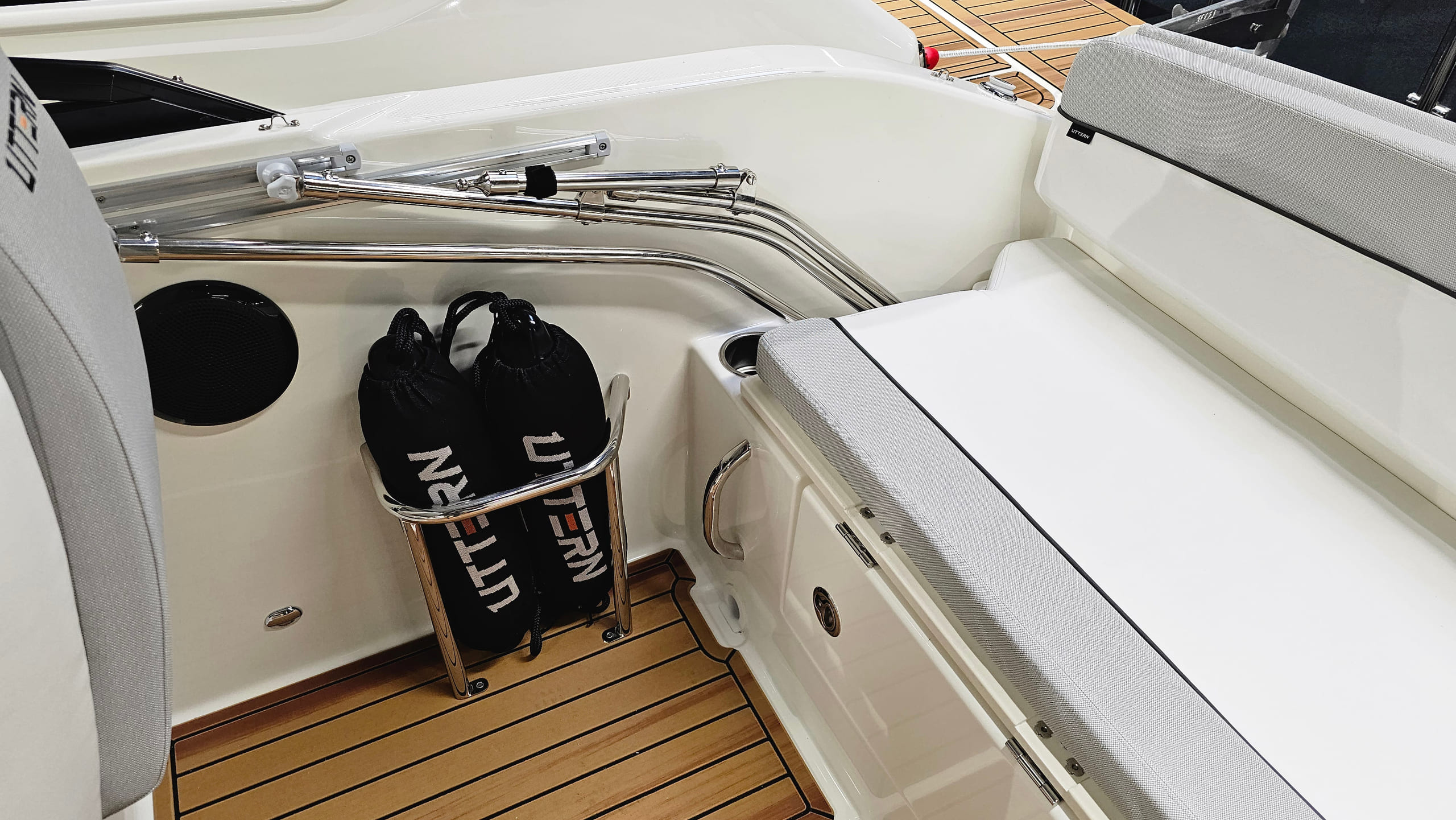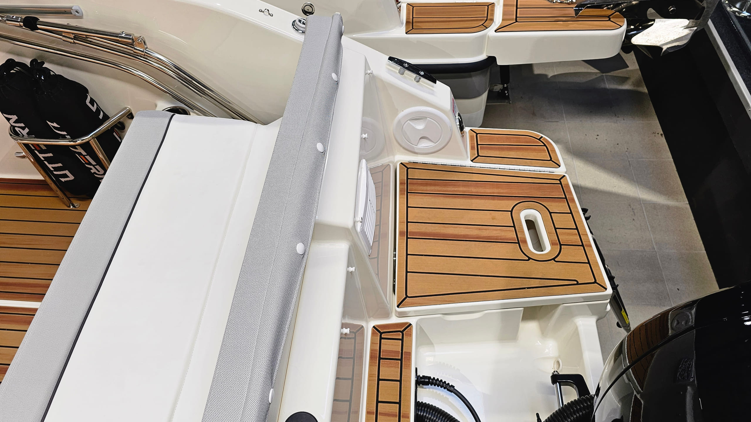 Tingene dine holder seg tørre i oppbevaringsrom under svømmeplattformen og under akterbenken. Et tredje oppbevaringsrom er integrert under sitteområdet i kabinen. Selvsagt har også fendere og ulike tilvalg som omslutning eller et spisebord sine egne oppbevaringsrom.