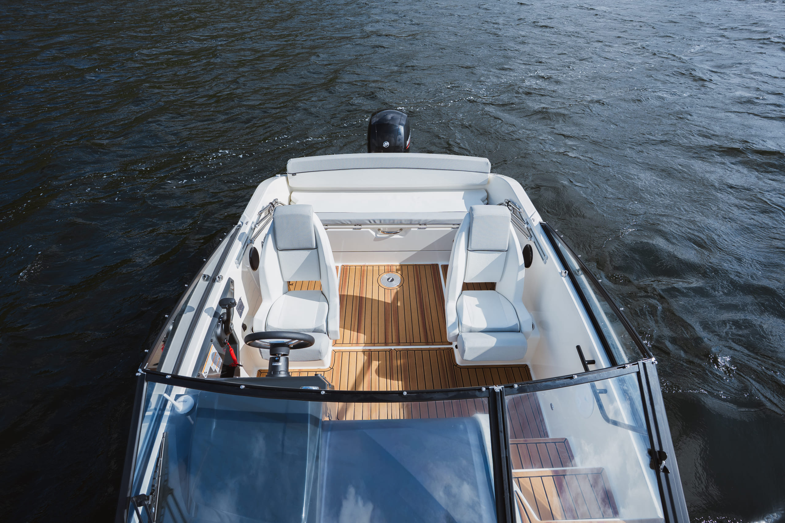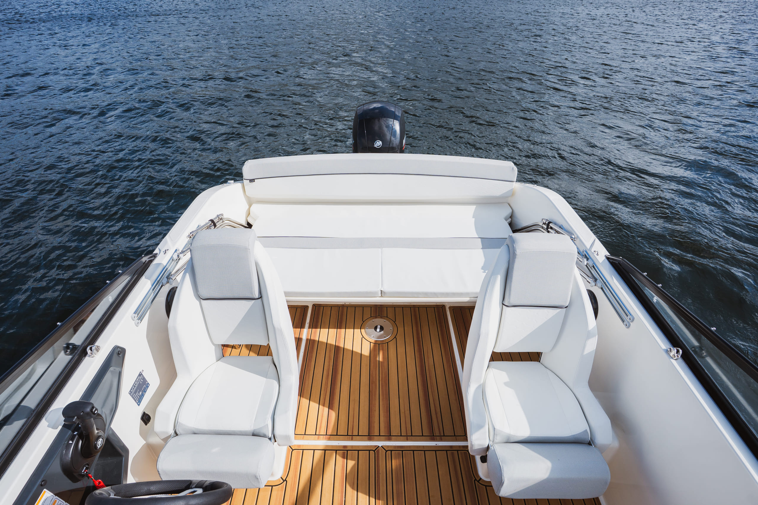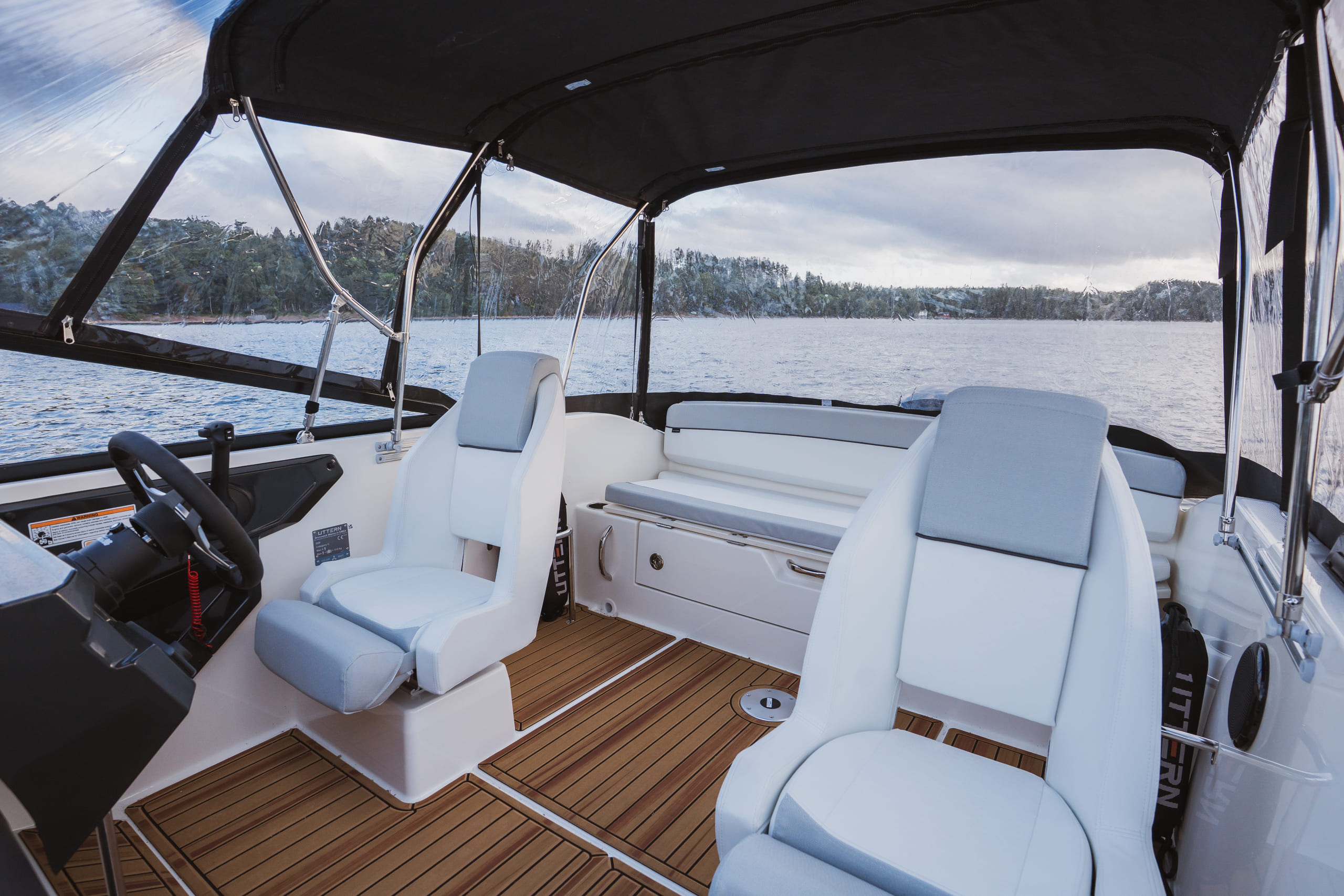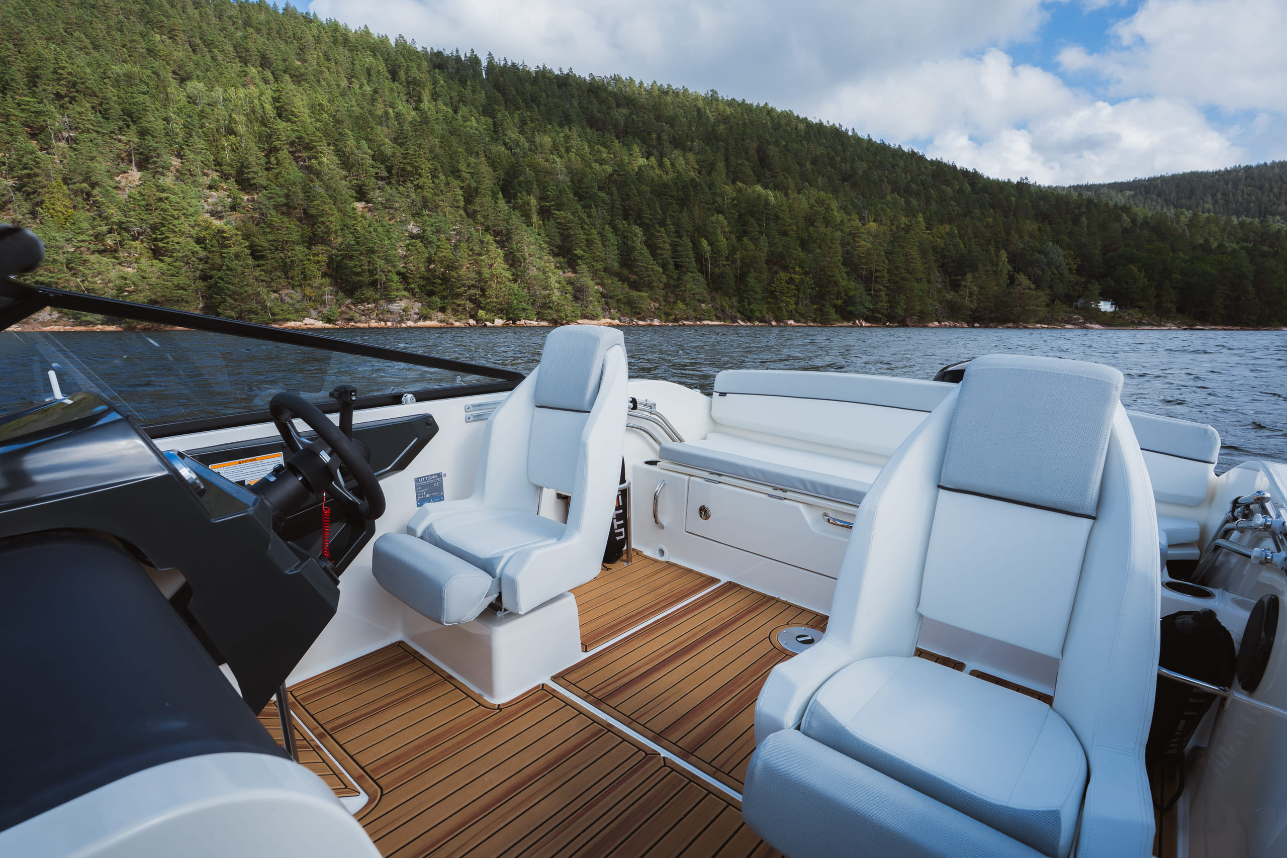 Som båtens kaptein kan du glede deg over at det svingbare setet ditt står på en base trukket i polyester for økt komfort. Passasjeren din, i et lignende sete, ser rett på smart plasserte steg til fordekket. Dette unike designet gir plass til en kabindør i midten av cockpiten. Den tonede kabindøren, en mindre luke som kan åpnes og en dekksluke gir lys og luft til kabinen. Inne har en dobbeltkøye plass til to personer som elsker å tilbringe natten på sjøen.