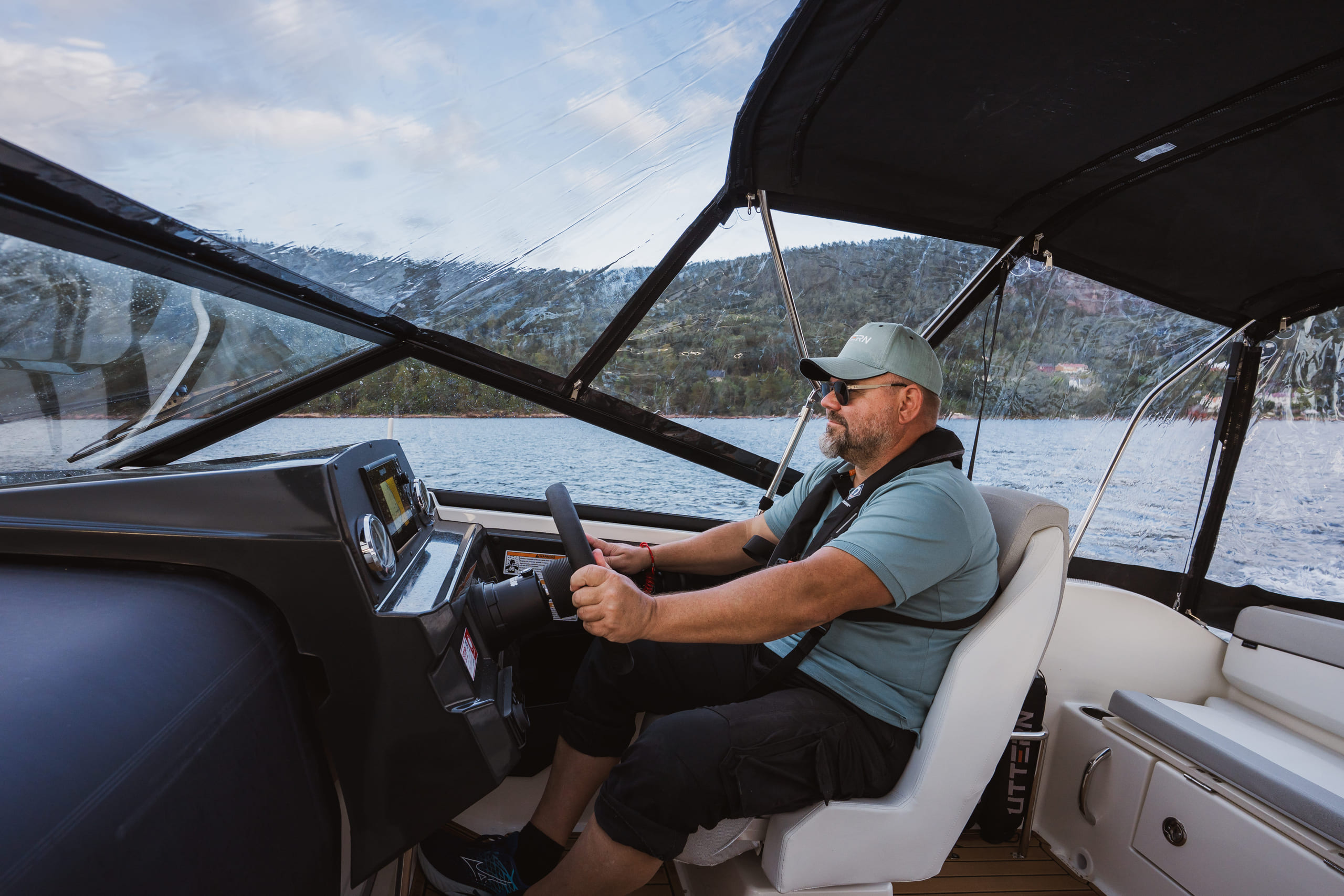 Du går inn og ut av Uttern D59 ved et klart definert av- og påstigningsområde. Den store badeplattformen med et trinn over motorbrønnbroen sikrer enkel tilgang ut i vannet og tilbake på dekk. I tillegg, hvis du tar med barna og de ikke kan sitte stille (ingen overraskelse der), går det helt fint. De høye rekkene på fordekket og den dype cockpiten lar dem bevege seg trygt rundt på familieturer.
