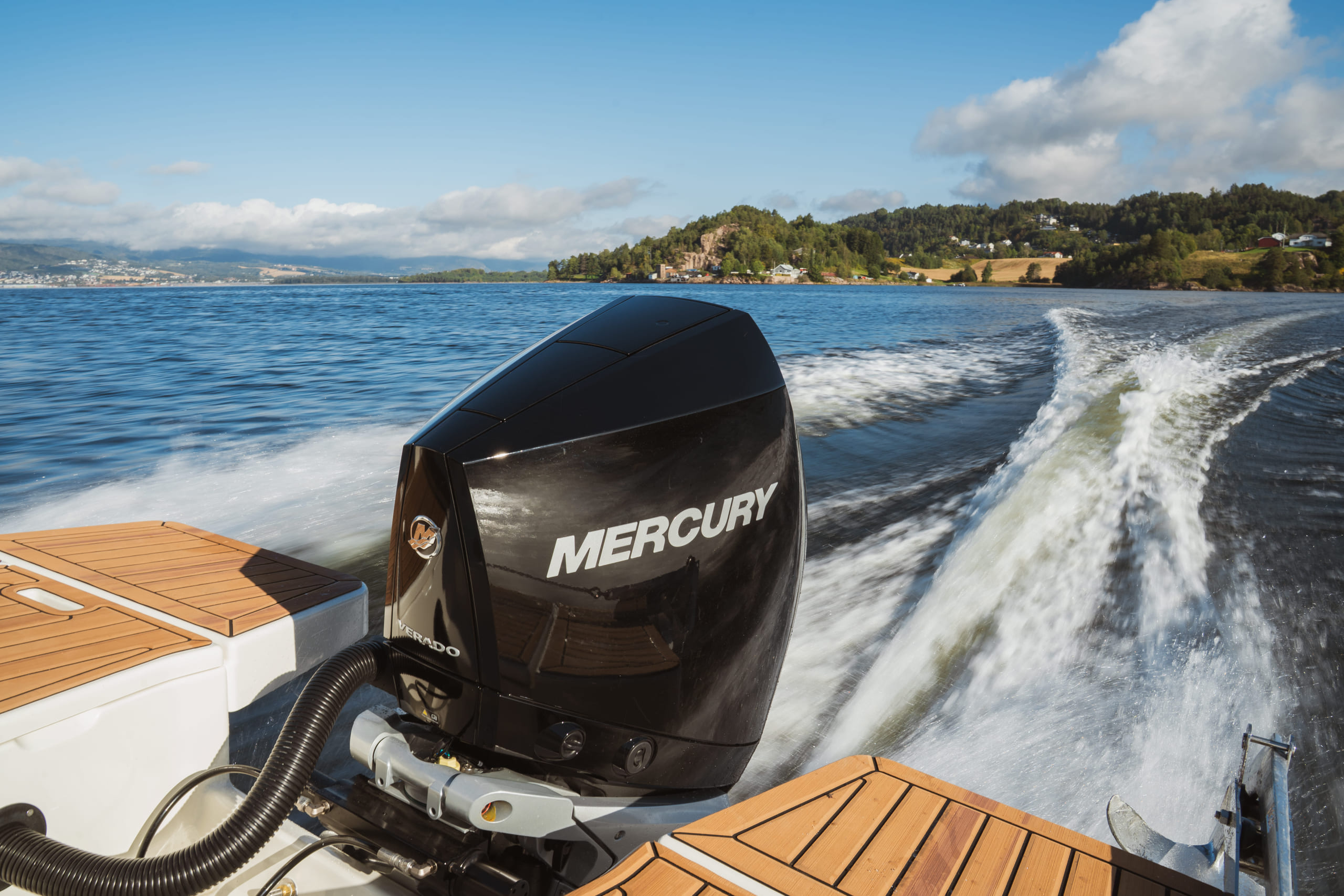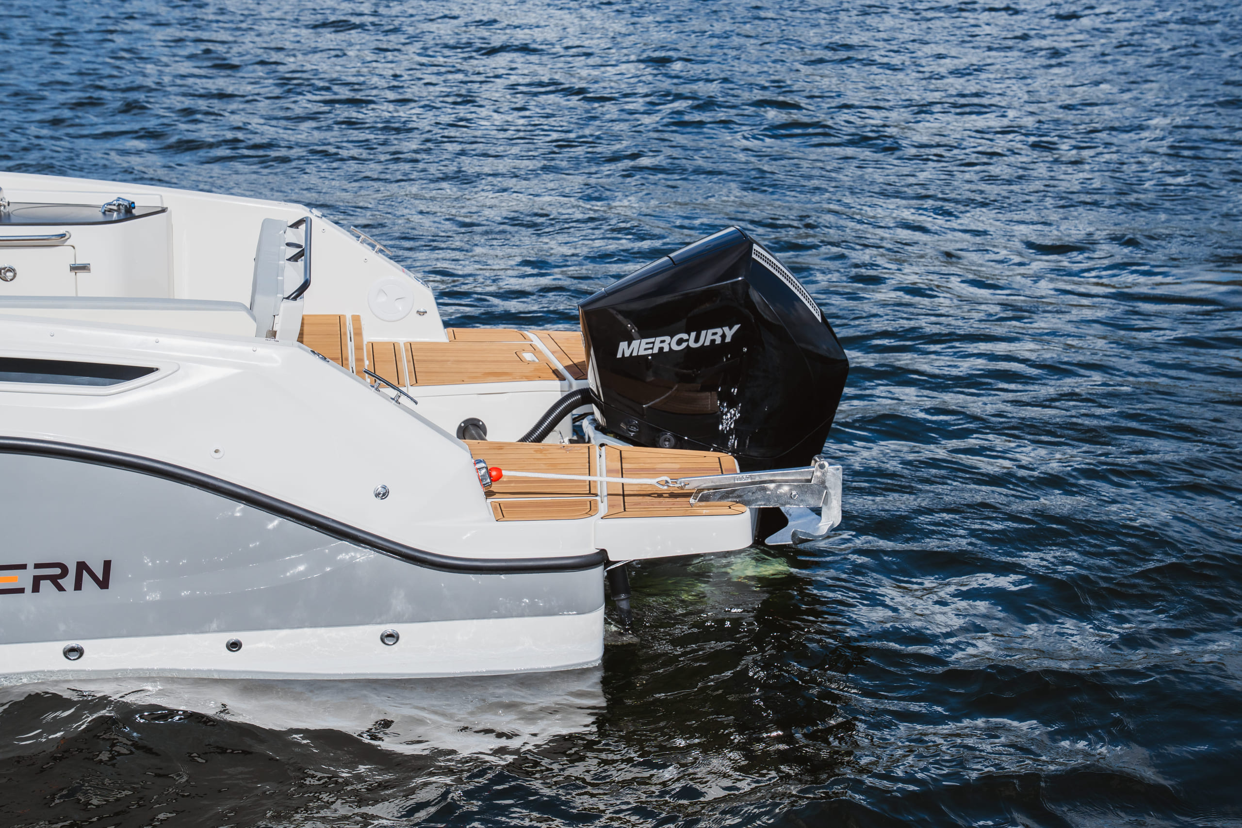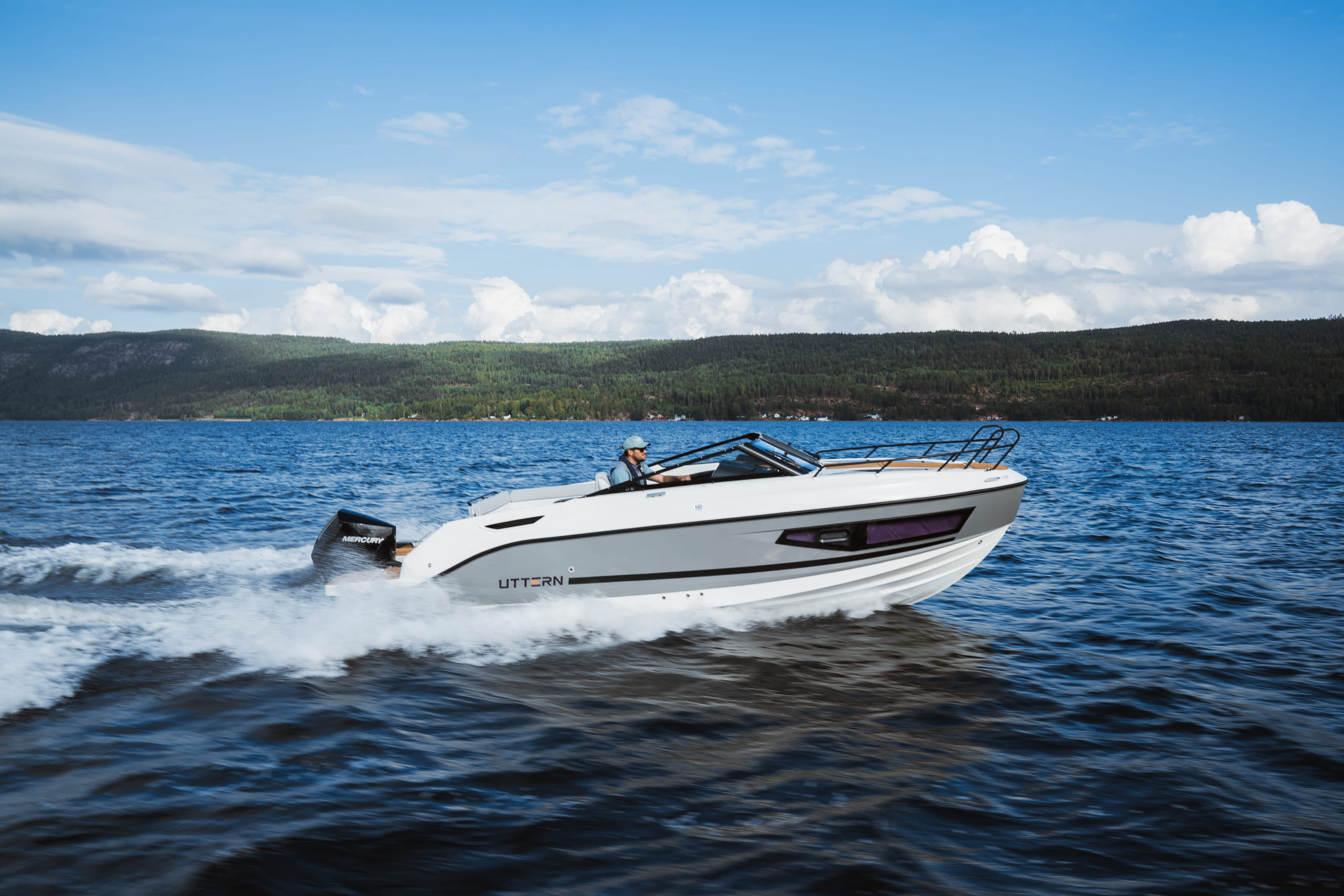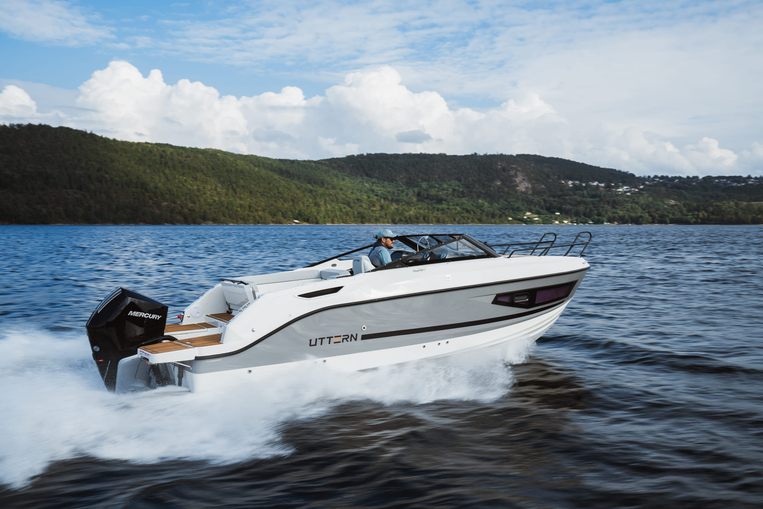 Uttern leveres med den Mercury motoren du selv ønsker. Enten med V-6 eller V-8 motor med effekt opp til 300 hester. Det gir rask respons, høy toppfart og enkel manøvrering. Cockpiten er lett å entre. Den har riktig plasserte gripehåndtak, og det er uproblematisk å bevege seg gjennom båten fra baug til hekk og via badeplattformene kan du gli ut i vannet.