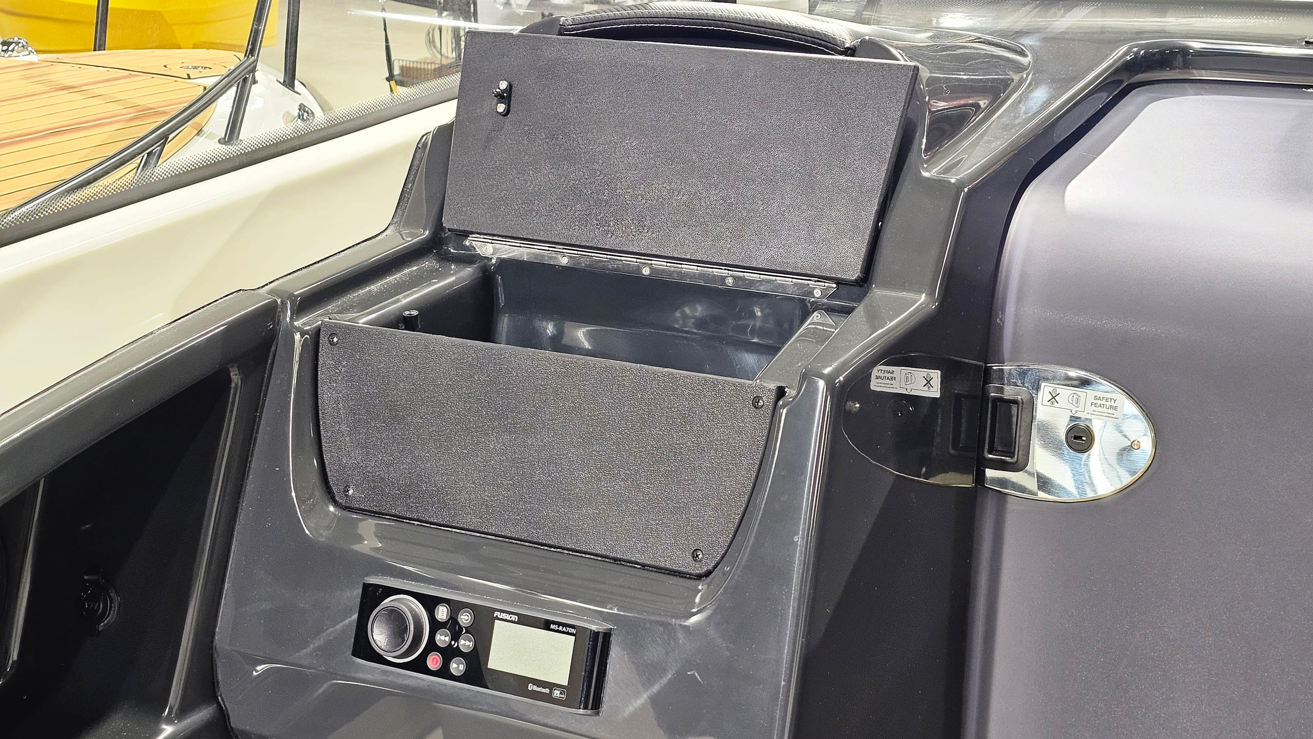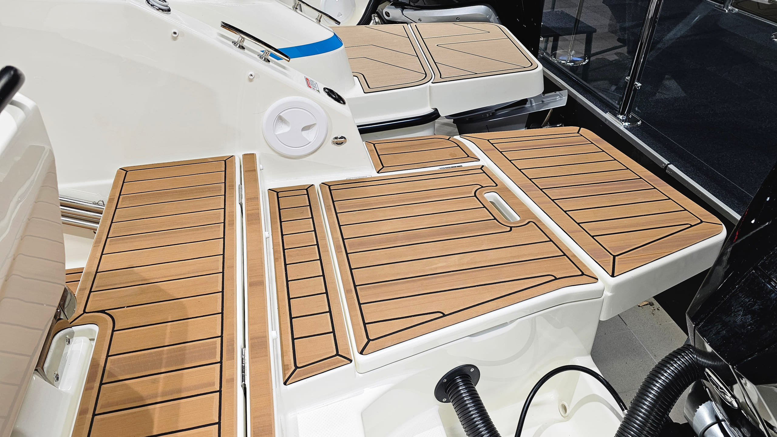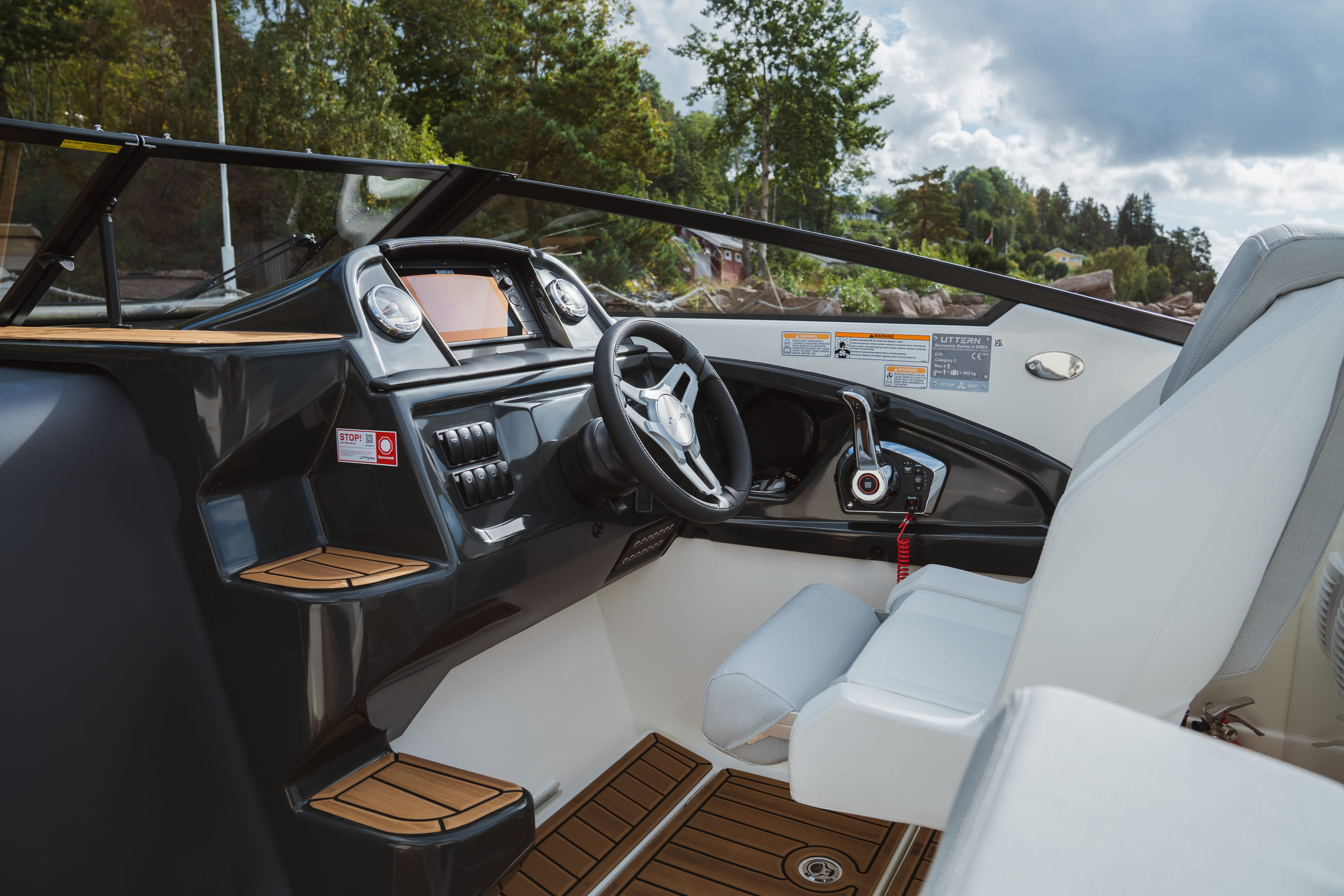 Med den dype cockpiten er båten trygg også for små barn som er med på tur. Vindskjermen med vindusvisker gir god beskyttelse mot vær og vind. Delikat og behagelig Gator Step syntetisk dørk gjør også båtturen komfortabel.